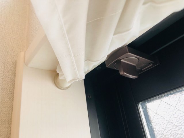 こちらの窓は、ちょっとだけ開けた状態で常時吸気口として使いたいので、窓をロックする商品で上下を固定しました。